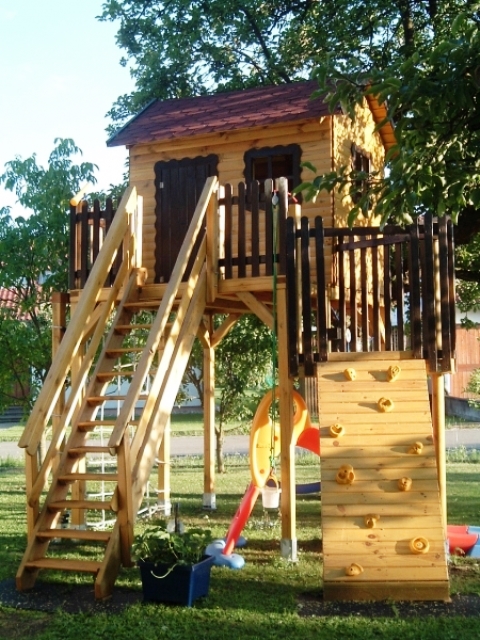 > Istnieje możliwość dokupienia do domku drzwi i okiennic, a także schodów, pokrywy piaskownicy, stojaka na huśtawki mocowanego do boku domku, trójkątnej dostawki umożliwiającej przymocowanie ślizgu