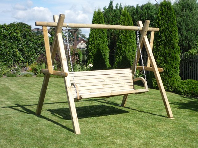 Huśtawka TRIO zawiera wolnostojący stojak wraz z ławką z poręczami.