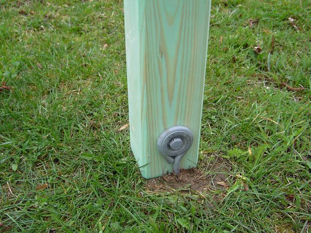 Aby zabezpieczyć domek lub stojak na huśtawki, należy wkręcić kotwy do gruntu przy nogach konstrukcji i śrubą, poprzez oczko w główce kotwy, przykręcić kotwy do nóg.
