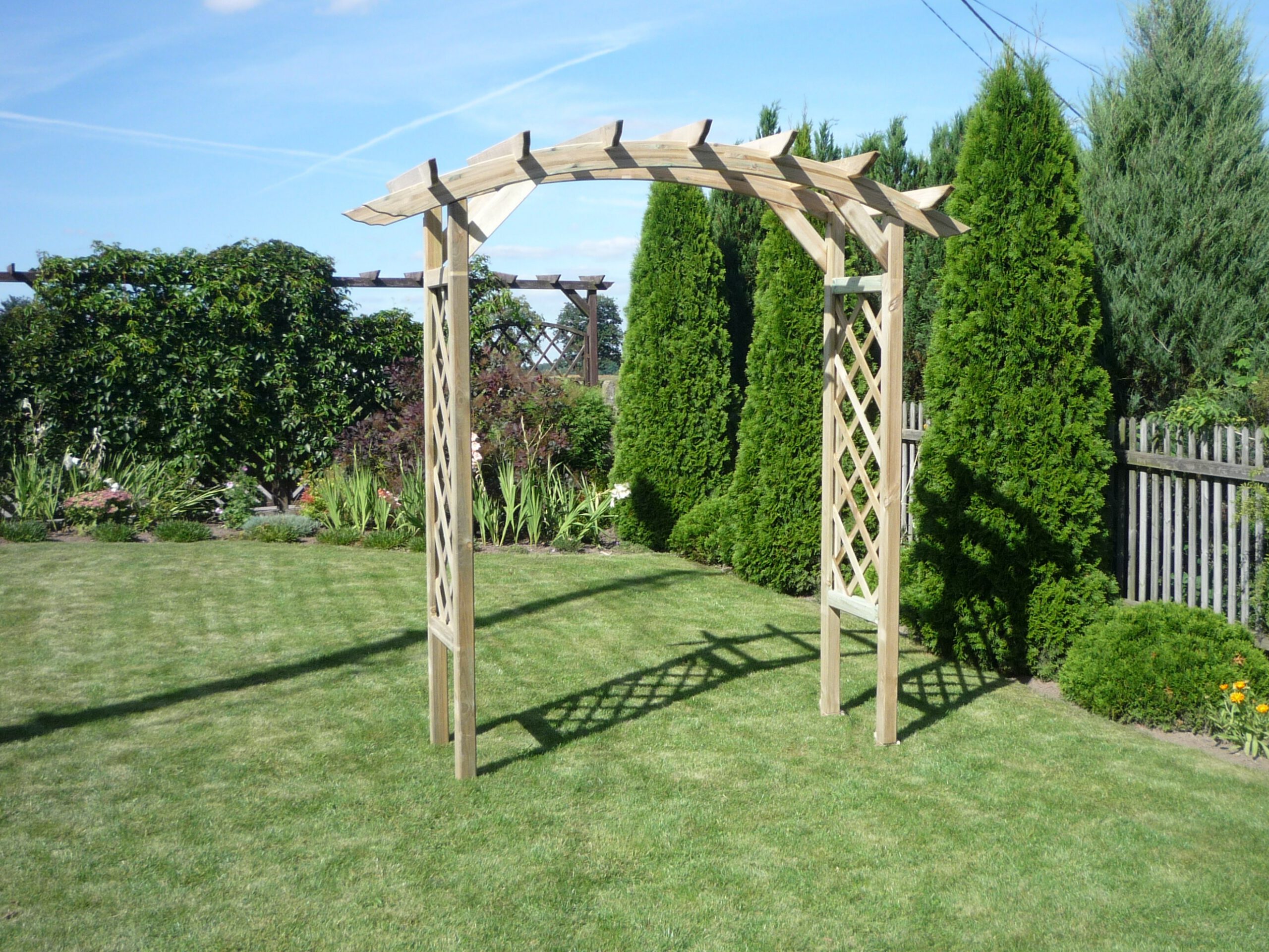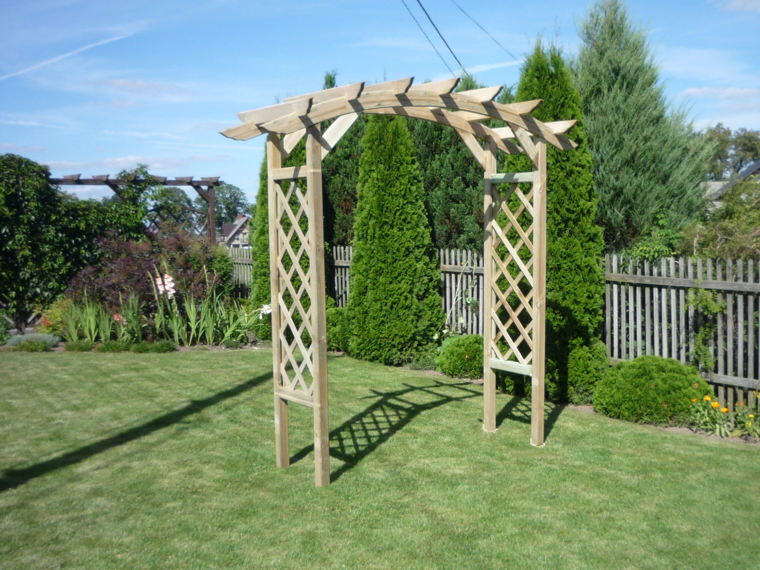 Pergola z łukiem o szerokości wejścia 200 cm wykonana z impregnowanego ciśnieniowo drewna sosnowego.