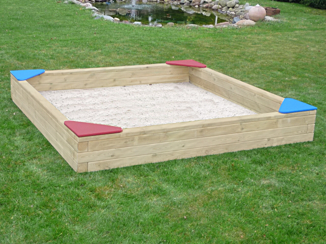 W rogach piaskownicy znajdują się kolorowe (czerwone i niebieskie) trójkątne siedziska narożne wykonane ze sklejki foliowanej o grubości 18mm.