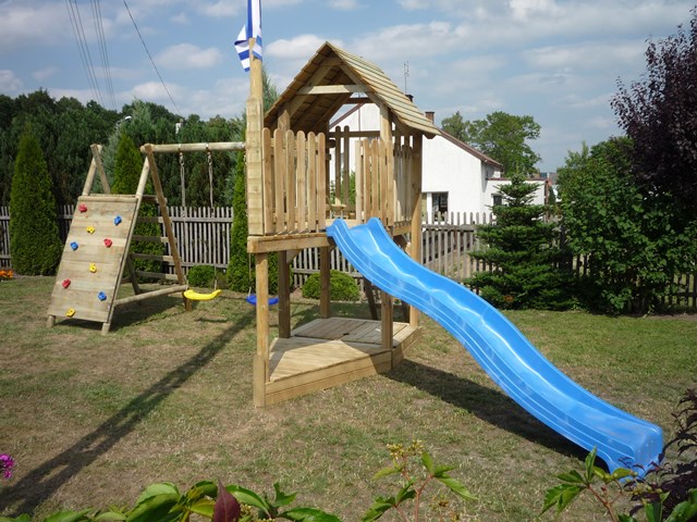 Domek wykonany jest z impregnowanego ciśnieniowo drewna sosnowego i doskonale wkomponuje się w każdy ogród, w którym bawią się małe szkraby.