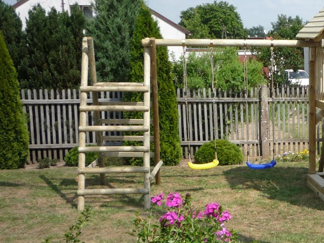Stojak z belką górną 240cm mieści swobodnie 2 standardowe huśtawki. W przypadku montażu bocianiego gniazda i standardowej huśtawki konieczna jest górna belka o długości 300cm.