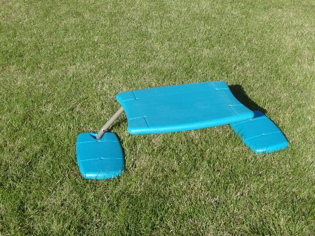 Stoliczek z siedziskami w kolorze turkusowym. Wykonany z materiału HDPE formowanego metodą wtryskową. Rama metalowa stoliczka malowana proszkowo.